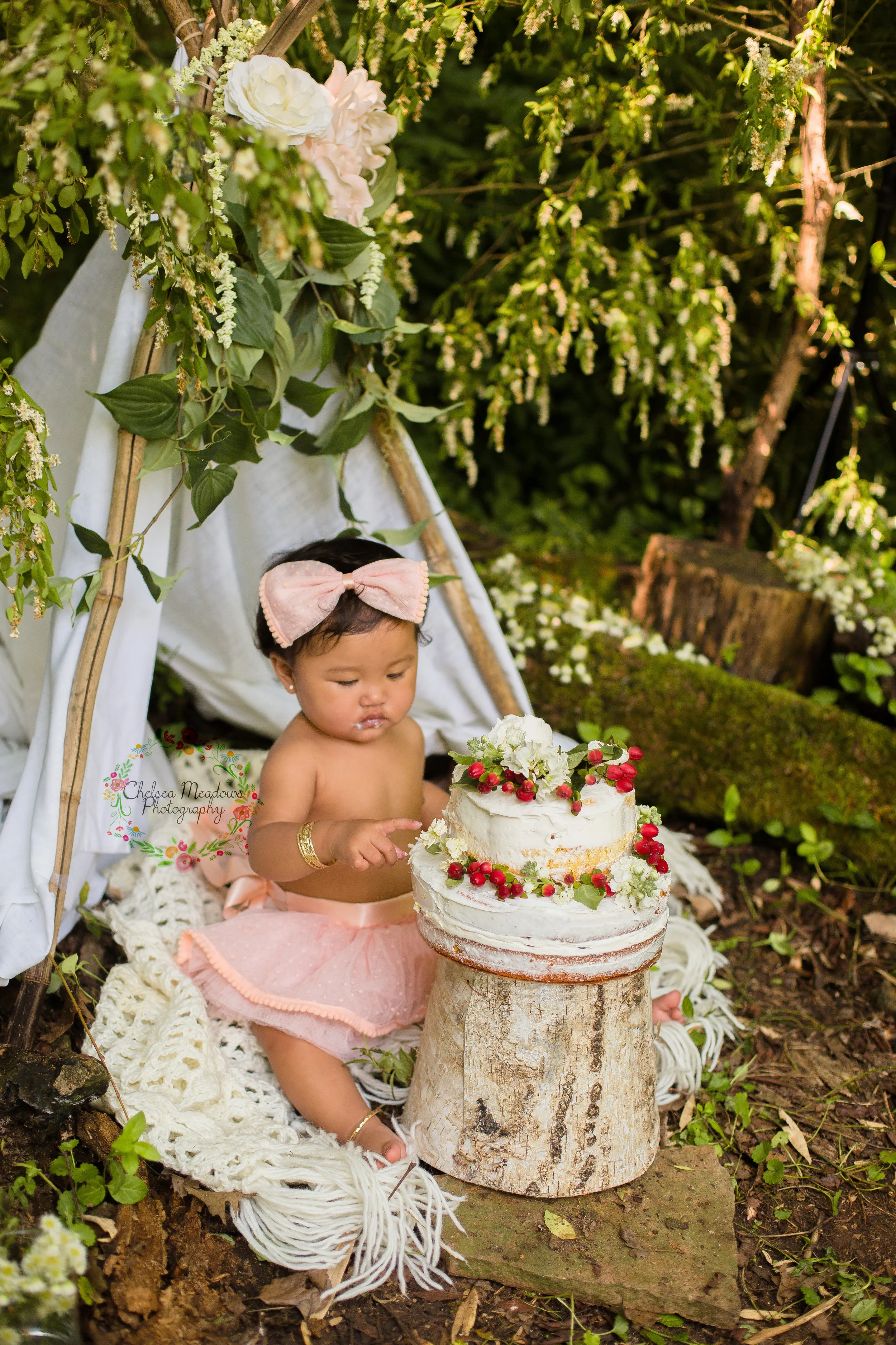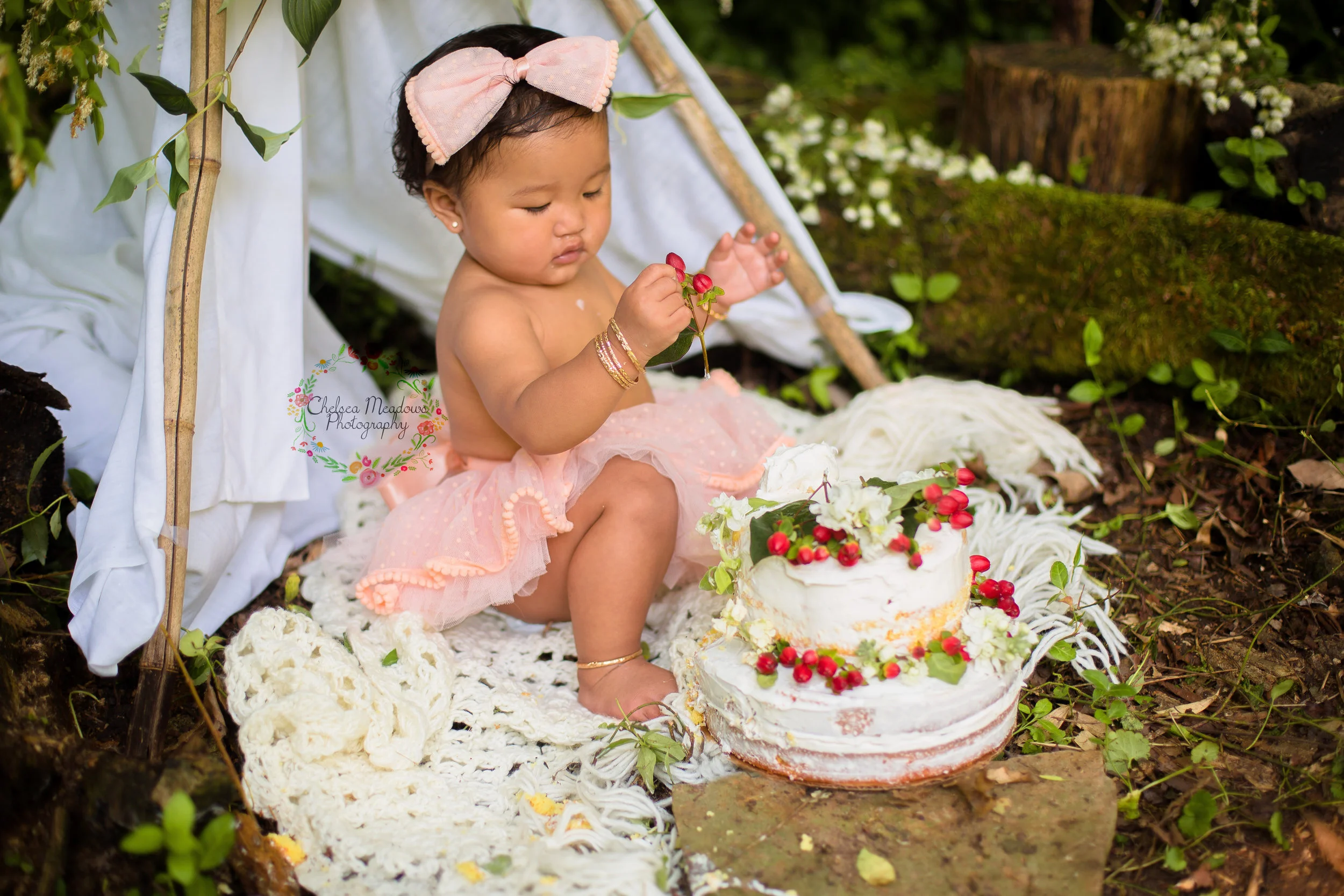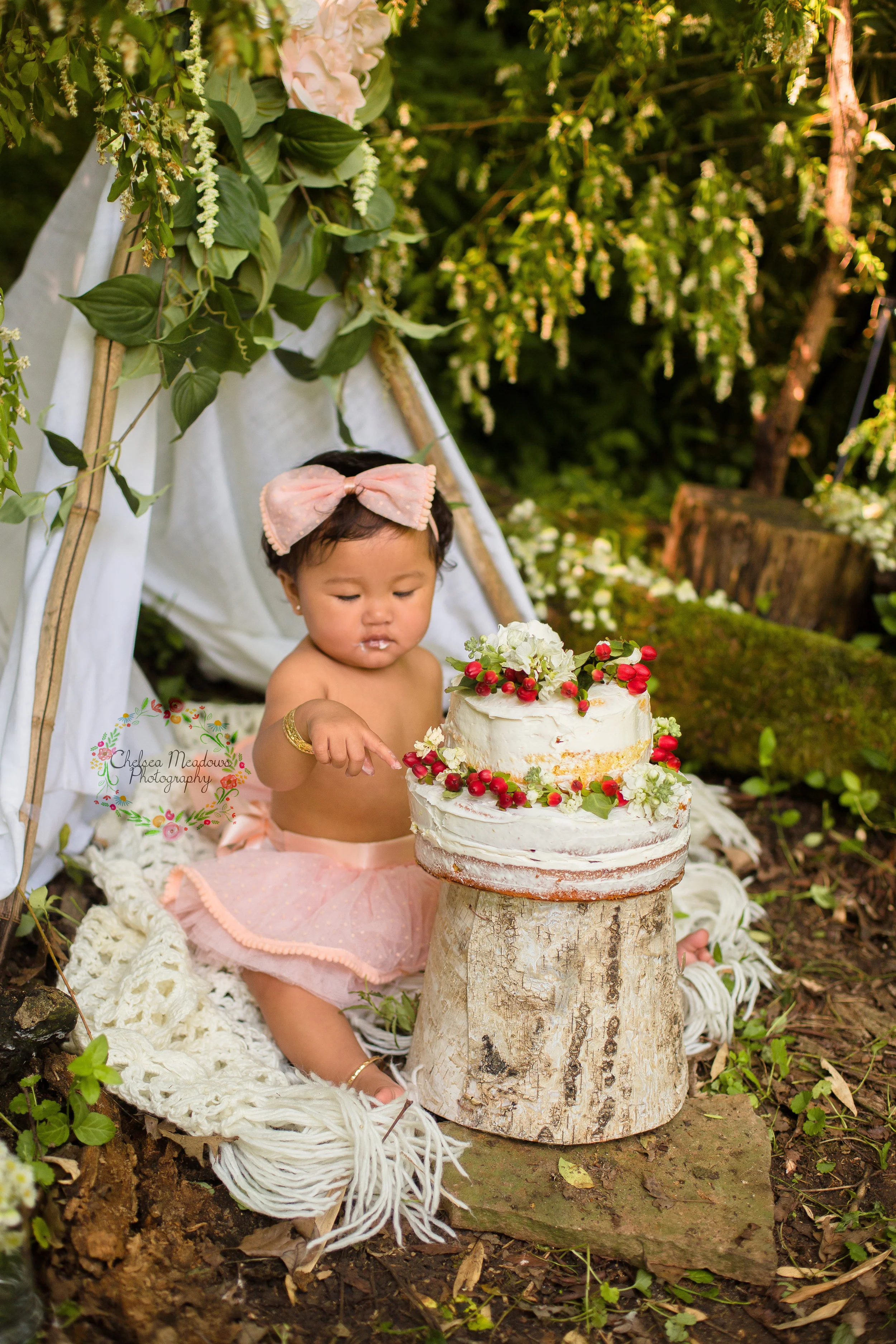 This little lady has graduated from the baby plan and oh my goodness she grew about 2 feet from the time we did her family session to the time we did her cake smash!!! She's so long and beautiful just like her sisters, I hate it for Mama J & Papa R! They're going to have it rough with three beautiful little girls... I feel like these little ladies are now my nieces I've gotten so close to all them! They're always so kind, well behaved, and engaging and I look for any excuse to go see them! Anyways, just a few weeks back Baby P had her cake smash and oh my goodness I can not tell you how many images are in their gallery that are just of the cake smash!!! (It's somewhere around 50!) Because there were so many photos I am so in love with just from the CS I'm doing a blog exclusively on this portion of the session and another one for the family! Her Mama & I share a love for all things Shabby & Frilly, which I guess you have to when you have 3 girls, and I loveeee outdoor sessions so this made for a perfect combination! Little Ms. P has so much self control too, we learned from her birthday that she is not a huge fan of icing so I made a nude cake covered in lots of yummy fruit for her! It was still surprising though when she didn't even break into the cake, she spent her session munching on the strawberries and dodging the blueberries. You can tell in some of the photos too where she hit a bitter one an was not pleased but overall she loved it just as much as we did!