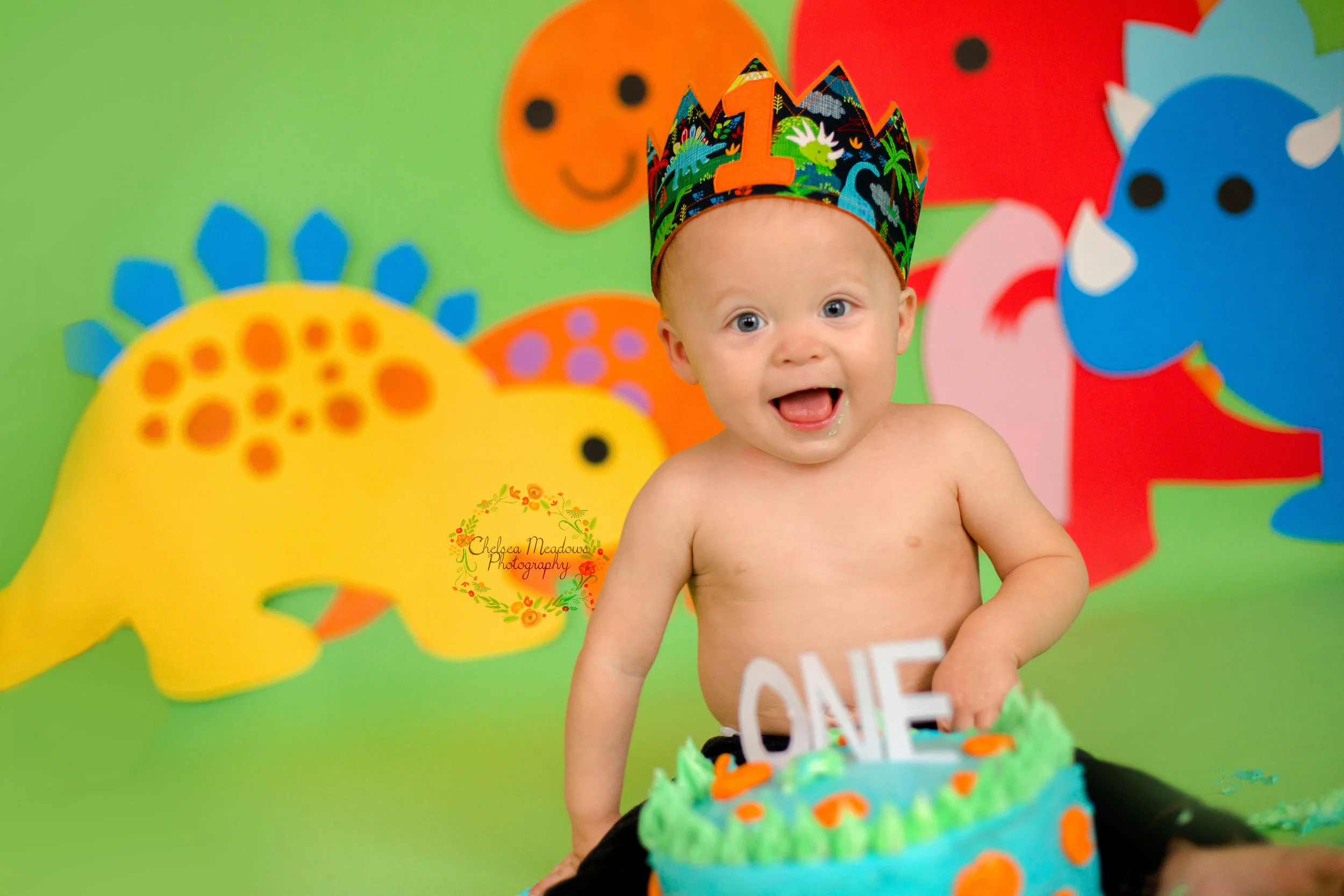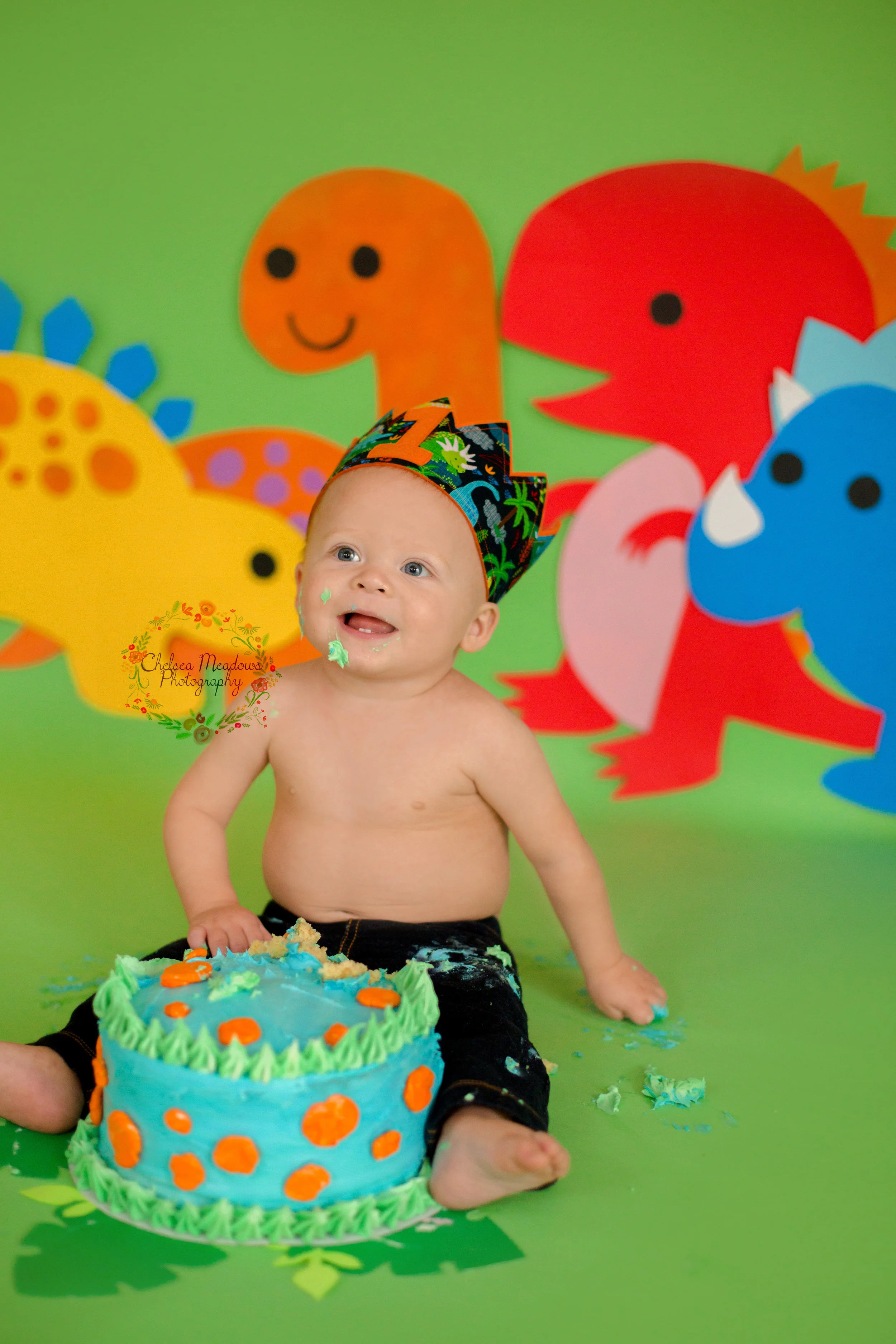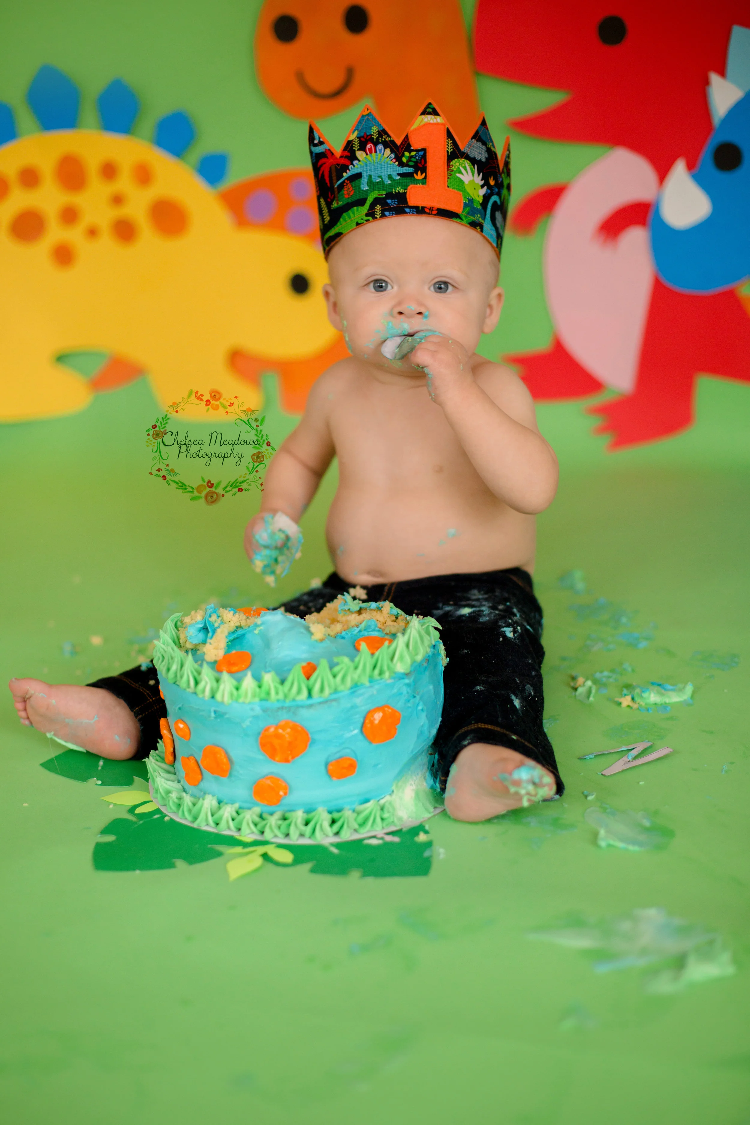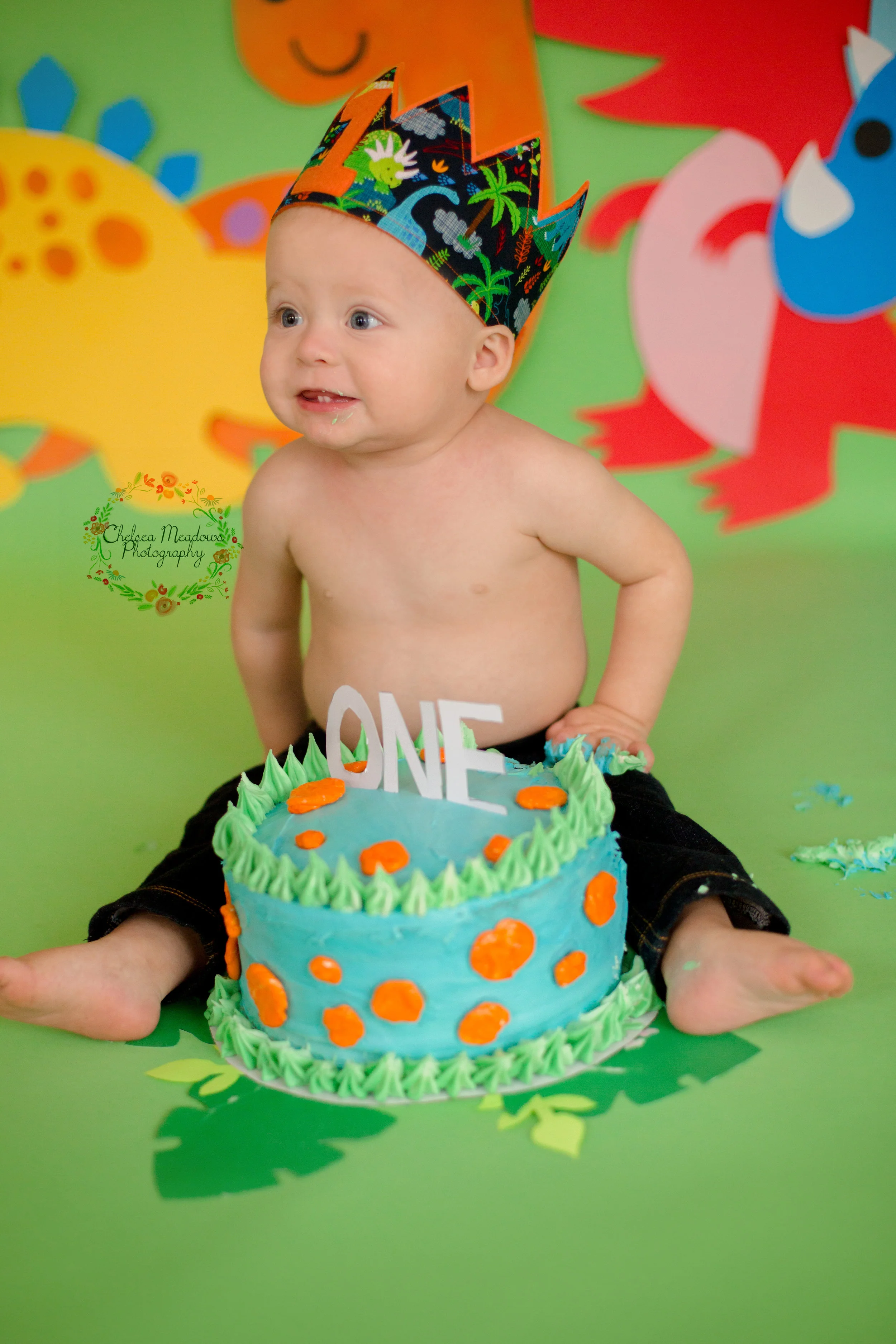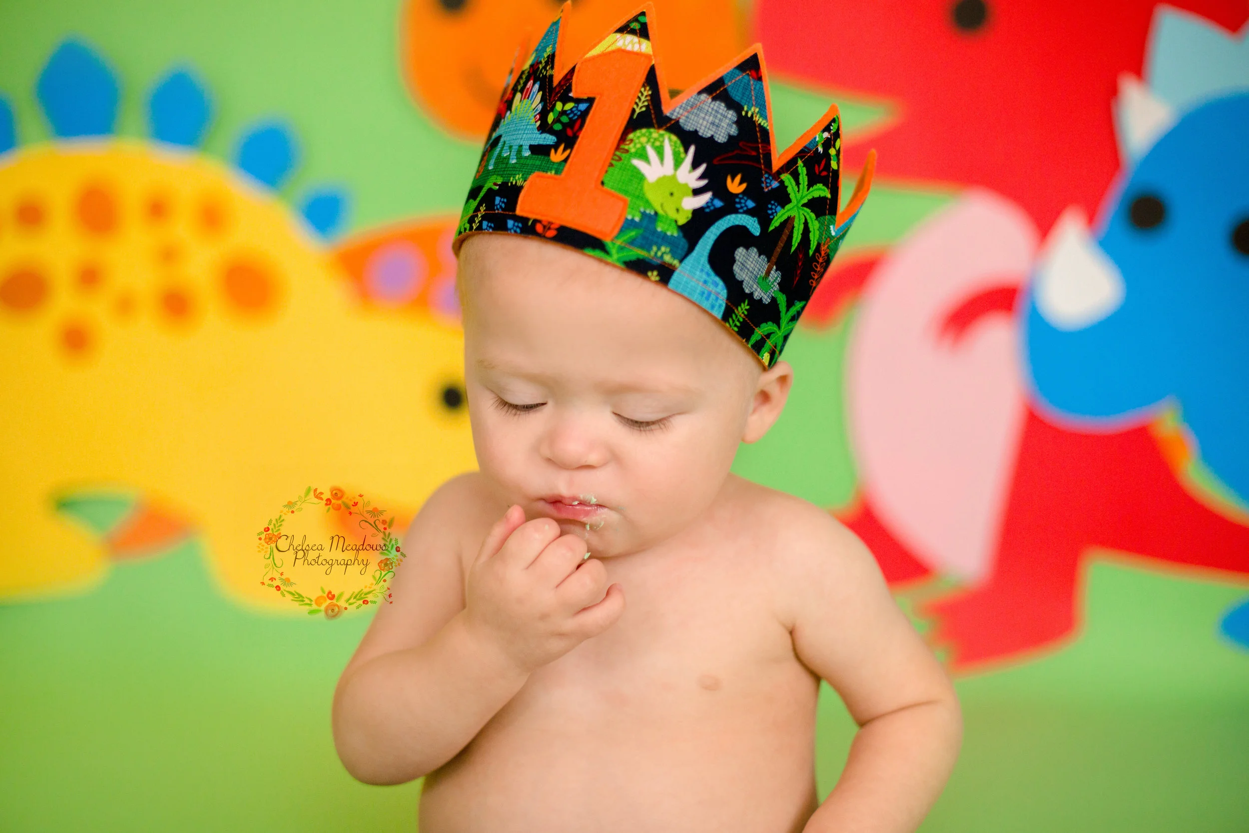 Even though he was unhappy being covered in icing he loved splashing his feet in the sink, which was probably the cutest thing I've seen in forever, and exploring the sun room where I have my studio set up. He was so happy when he didn't have to look at the cake (I tried to explain to him that it wasn't a real volcano!). Check out Baby A rockin his Dino hat & 'considering' his cake!